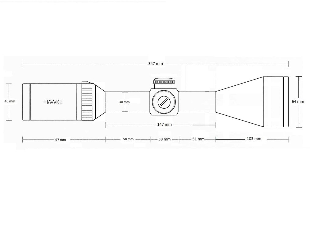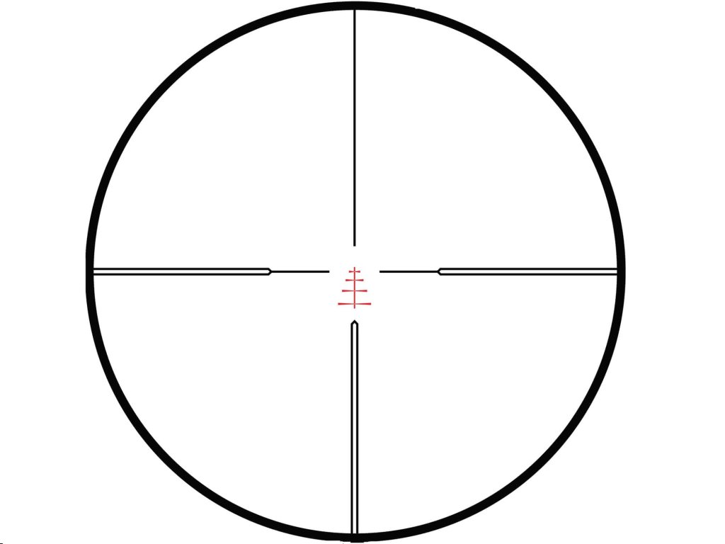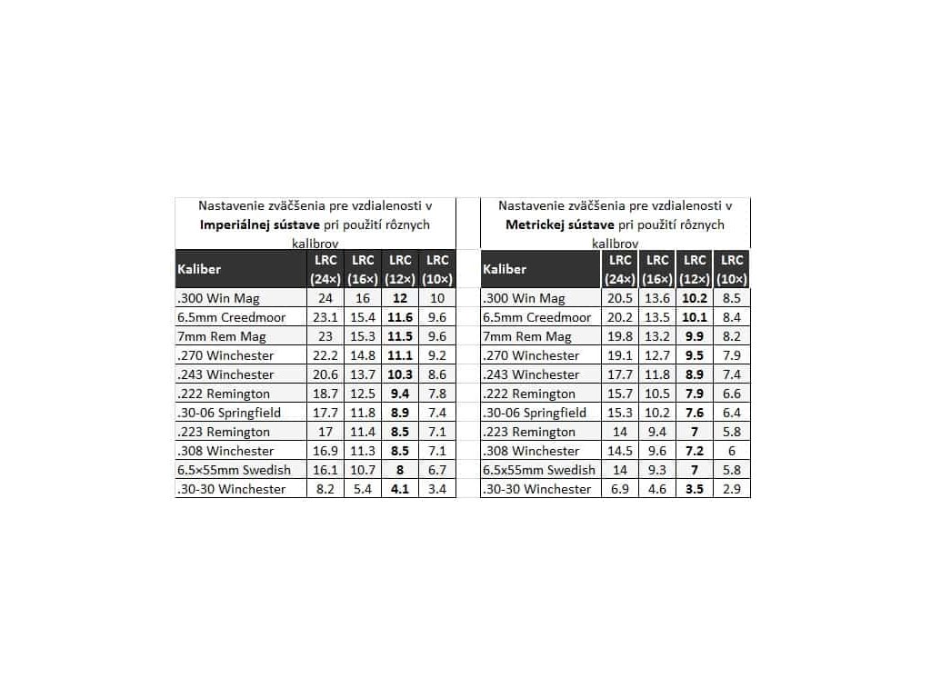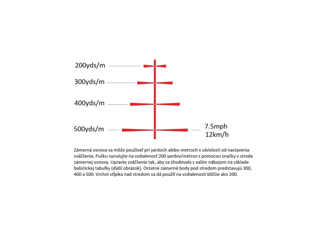 Zámerná osnova LRC (12x) – Pri práci s trajektóriou vašich nábojov, LRC (12x) zámerná osnova (výlučne od firmy Hawke) poskytuje vhodné cieľové body pri streľbe alebo love s použitím centrefire nábojov na Dlhú Vzdialenosť. Zámerná osnova je špeciálne navrhnutá okolo balistických profilov centrefire nábojov, čo umožňuje dosiahnuť oveľa väčšiu presnosť pri mierení nad/pod. LRC (12x) zámerná osnova je vyleptaná do skla a obsahuje podsvietený cieľový bod s horizontálnymi značením pre lepšiu presnosť, ktoré vyniká proti listovým a tmavým pozadím. Cieľové body zámernej osnovy sú navrhnuté tak, aby sa medzery zvyšovali. Toto presnejšie predstavuje pokles trajektórie strely (čím ďalej guľka cestuje, tým rýchlejšie guľka padá). Všetko čo potrebujete urobiť, je upraviť nastavenie zväčšenia tak, aby zodpovedalo vašej balistike (nábojov, ktoré používate). Zámerná osnova sa môže používať pri yardoch, alebo metroch v závislosti od nastavenia zväčšenia. Nastreľte/Vynulujte pušku na vzdialenosť 200yardov/metrov s použitím cieľového bodu umiestneného v strede zámernej osnovy. Nastavte zväčšenie tak, aby zodpovedalo hodnotám pre daný typ náboja (uvedené v tabuľke pre dané typy nábojov). Cieľové body pod stredom predstavujú vzdialenosti 300, 400 a 500. Horná časť stĺpika nad stredom môže byť použitá pre vzdialenosti bližšie ako 200.