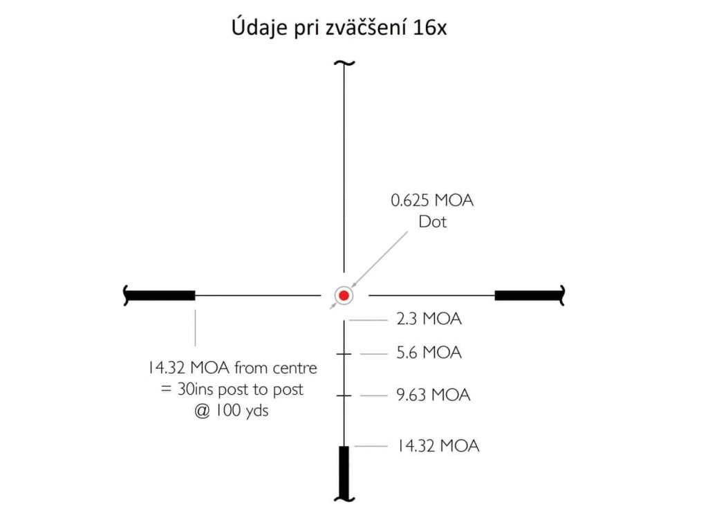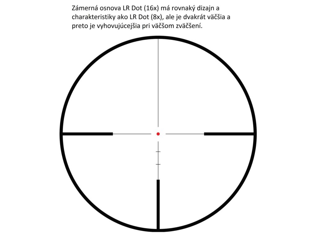 Zámerná osnova LR Dot (16x) – Do skla vyleptaná zámerná osnova s červeným podsvietením stredovej bodky (poskytuje 6 stupňov jasu). Varianta klasickej zámernej osnovy L4, LR Dot (16x) používa viac otvorenejšie vonkajšie body, pre lepšiu viditeľnosť cieľa počas mierenia a poskytuje aj extra cieľové body. Tenké vonkajšie body robia viditeľnosť jednoduchšiu hlavne pri znížených svetelných podmienkach. Jemná horná časť vôbec neruší viditeľnosť cieľa. Jasná 0,5 MOA veľká stredová bodka (pri 16x zväčšení) dáva ostrý zámerný bod pre rýchlu referenciu a nájdenie cieľa. Priestor medzi stredovou bodkou a tenkým stĺpikom meria 15“ keď mierite na cieľ vzdialený 100yds pri 16x zväčšení. Toto sa rovná 50cm rozostupom od stredu po stĺpik na vzdialenosť 120m pri 16x zväčšení. Extra zámerné body sa nachádzajú v tenkej dolnej časti. Slúžia pre streľbu na dlhšie vzdialenosti, kde pri nastavení nuly na 100 metrov sa nižšie zámerné body rovnajú 200, 300 a 400 metrom.