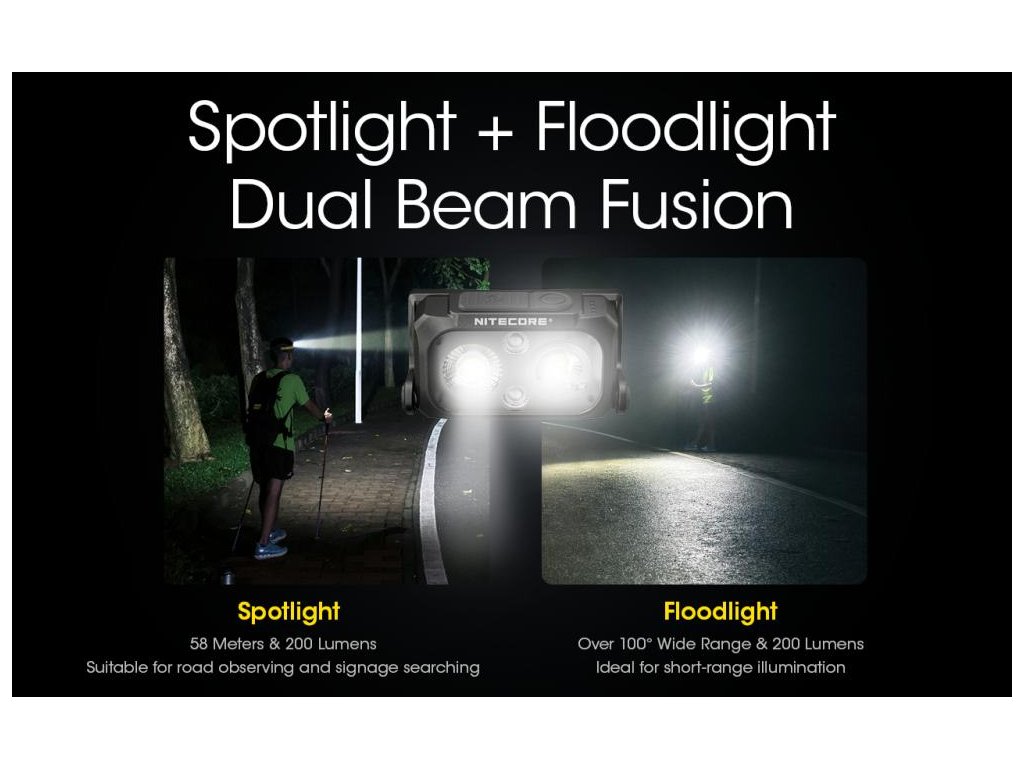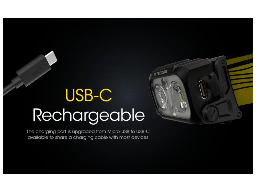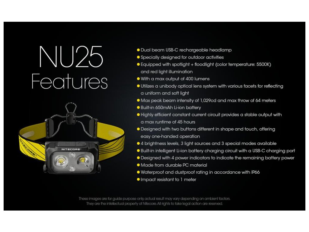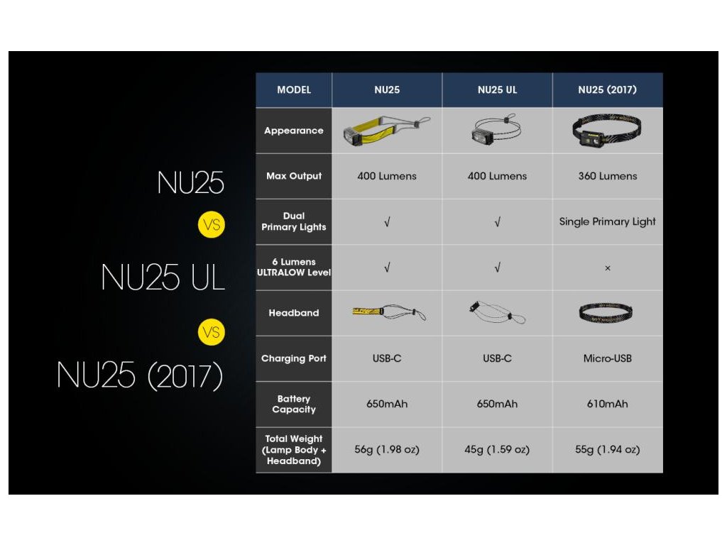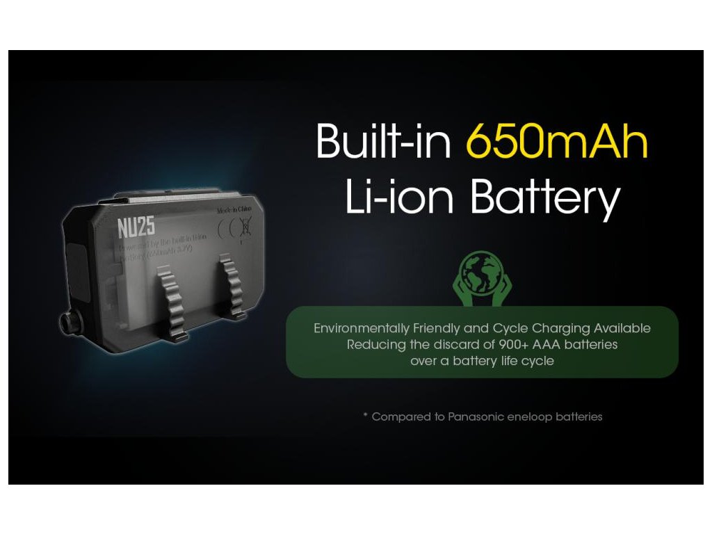 NU25 je dvoj lúčové svietidlo na čelo s USB-C dobíjacím portom.