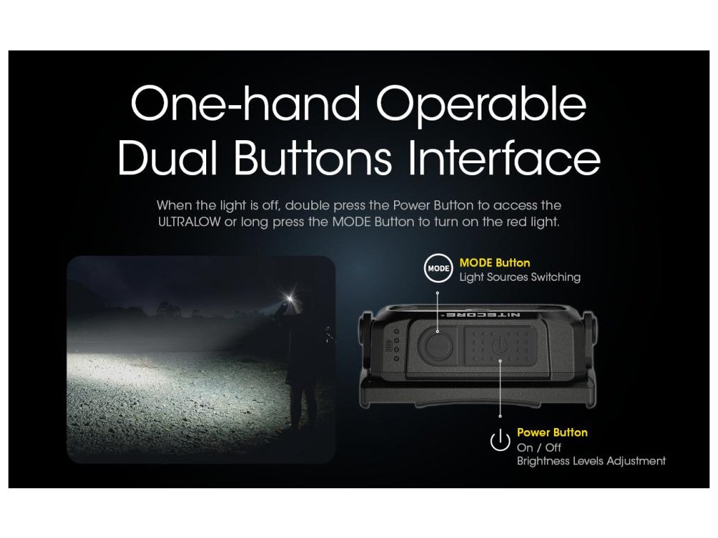 - Má dve ovládacie tlačidlá, ktorých tvar umožňuje jednoduché ovládanie 4. úrovní jasu, 3. svetelných zdrojov a 3. špeciálnych režimov.