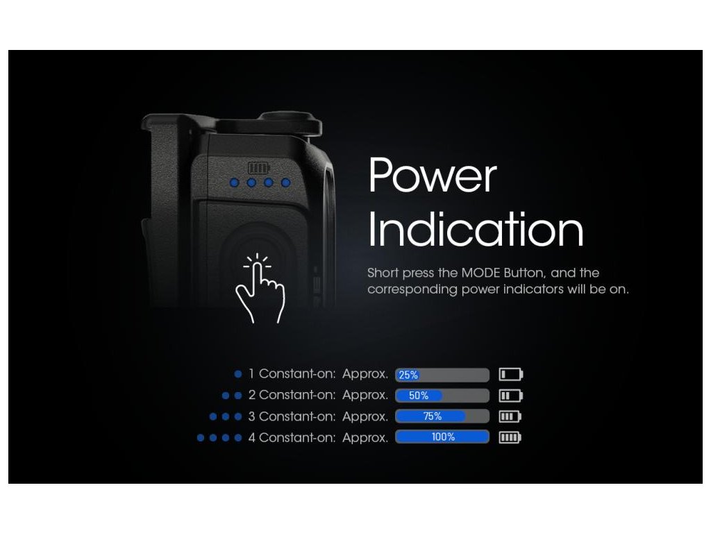 - Má zabudované 4 indikátory napájaniaindikujúce zostávajúcu energiu batérie.