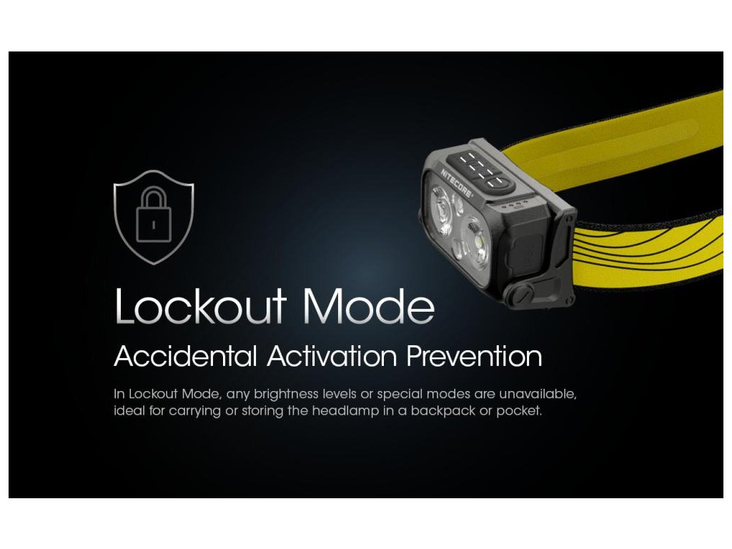 - Keď je svietidlo vypnuté, stlačte obe tlačidlá na 2 sekundy, kým čelovka 3-krát zabliká, čím signalizuje režim uzamknutia. V režime uzamknutia nie sú k dispozícii žiadne úrovne jasu ani špeciálne režimy a svietidlo jeden krát zabliká, čím signalizuje uzamknutý stav.
