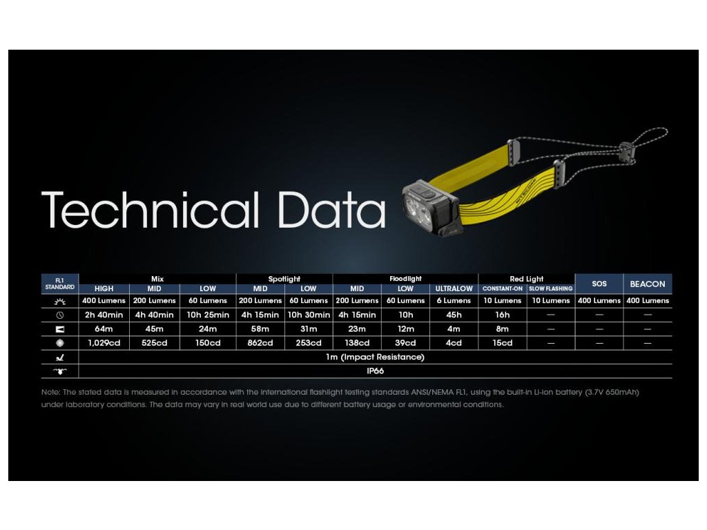 - Maximálna špičková intenzita lúča je 1029 cda maximálny dosvit do 64 metrov.